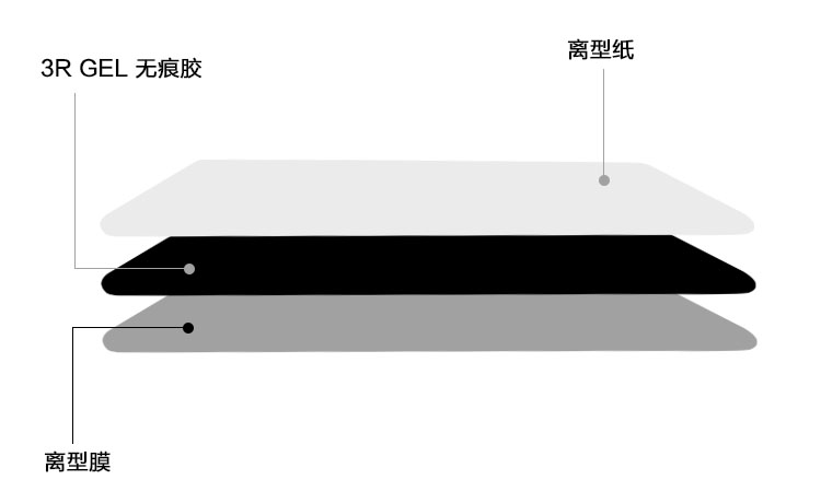 上图双面可移胶,由离型膜与3R GEL无痕可移胶组成,可做无基材与有基材两种,上图为无基材产品